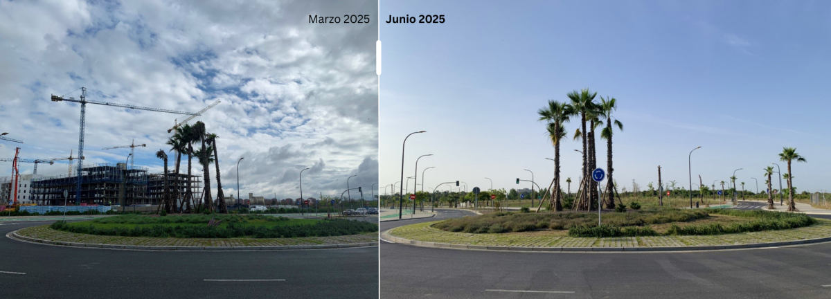 Rotonda de la Calle Barbados con la Calle Santorini – plantado en otoño de 2024 (izquierda: foto de marzo de 2025 - derecha: junio de 2025)