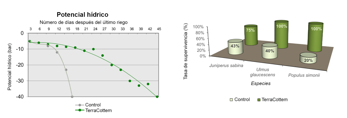 o Una vez finalizada el riego, el «potencial hídrico» (es decir, la disponibilidad de agua para la planta) se mantiene alto durante mucho tiempo con TerraCottem. o Ensayos demuestran que plantar con TerraCottem aumenta significativamente la tasa de supervivencia de varias especies de árboles.
