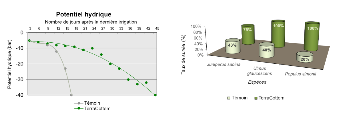 Des estáis montrent que planter avec TerraCottem augmente considérablement les chances de survie, et ce pour différentes espèces d’arbres. |
