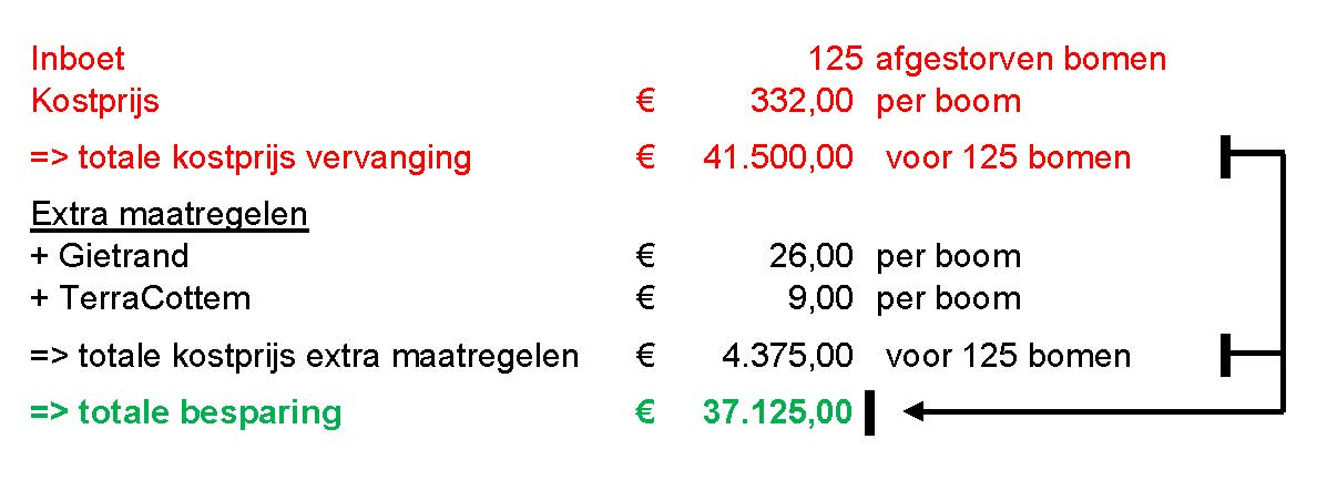 Als je weet dat de gemiddelde jaarlijkse kostprijs voor Stad Oudenaarde €332,00 per boom bedraagt en bovenstaande investering beperkt blijft tot €35,00 per boom (€26,00 voor de gietrand en €9,00 voor de bodemverbeteraar), dan kan je enkel concluderen dat dit op termijn een gunstig effect zal hebben op het totale kostenplaatje van de inboet.